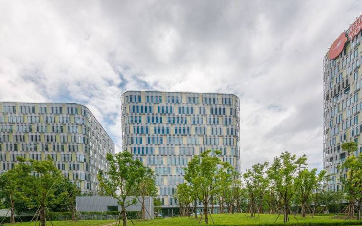 - 设计特色:园区设计独特,风格现代,主体抬高至二层,最大化开放地面的绿化空间,同时保留了六株大树,与建筑之间建立了亲密的互动关系。建筑由四座独立的悬浮体串联而成,底层的混凝土墙支撑着上部结构,并映射着外部的绿化环境,凸显了地面层的开放和上部的悬浮感。